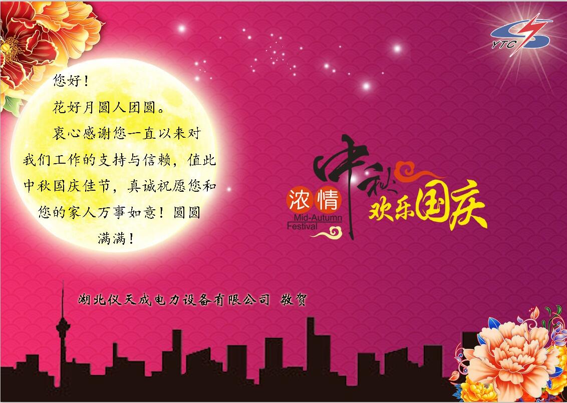在這舉國歡慶的時刻,湖北儀天成電力設(shè)備有限公司衷心的祝愿祝所有的員工,所有的新老客戶,國慶節(jié)以及中秋節(jié)快樂!