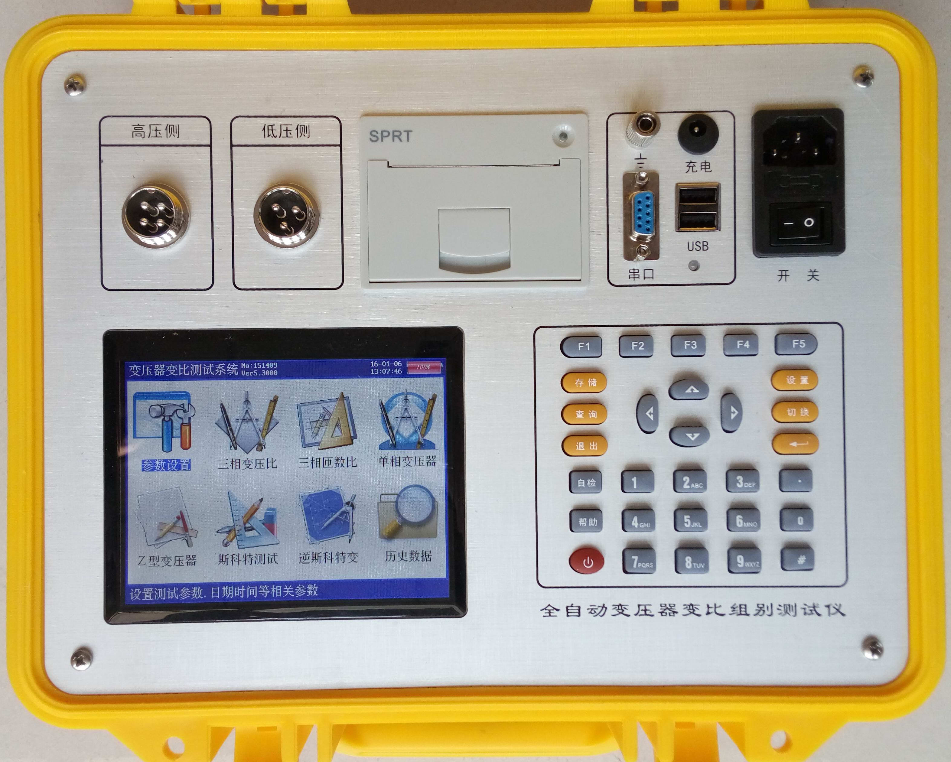 儀器左側(cè)上部是變比測試航空插頭,高壓側(cè),低壓側(cè)端子。左側(cè)下方是彩色液晶屏,右側(cè)下部是標準30鍵的控制鍵盤;在儀器的右側(cè)上部是打印機、接地端子、充電口、USB接口、RS232接口、電源線插口、工作開關(guān)。